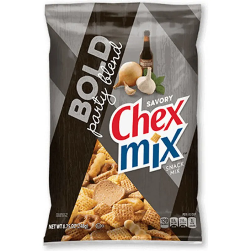 A mix of Chex cereal pieces, pretzels, mini breadsticks, and crispy crackers mixed with a unique, bold seasoning. Individually packaged in a single serve format for a convenient, grab and go snack with 60% less fat than potato chips.